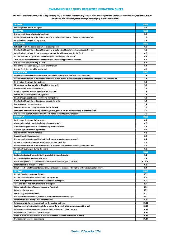 You can go over the rules by clicking on the World Swimming link above and there a some short codes below if your swimmer wants to explore disqualifications.